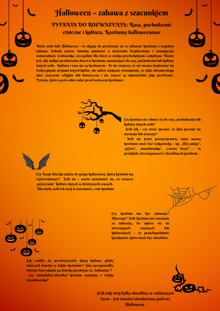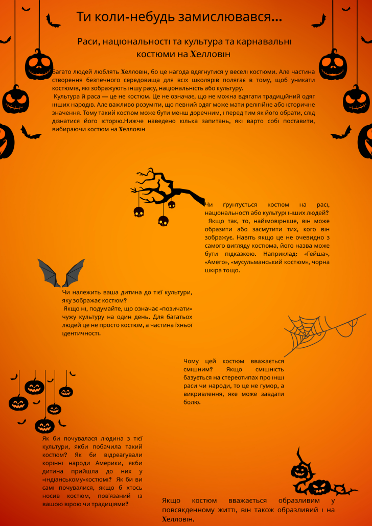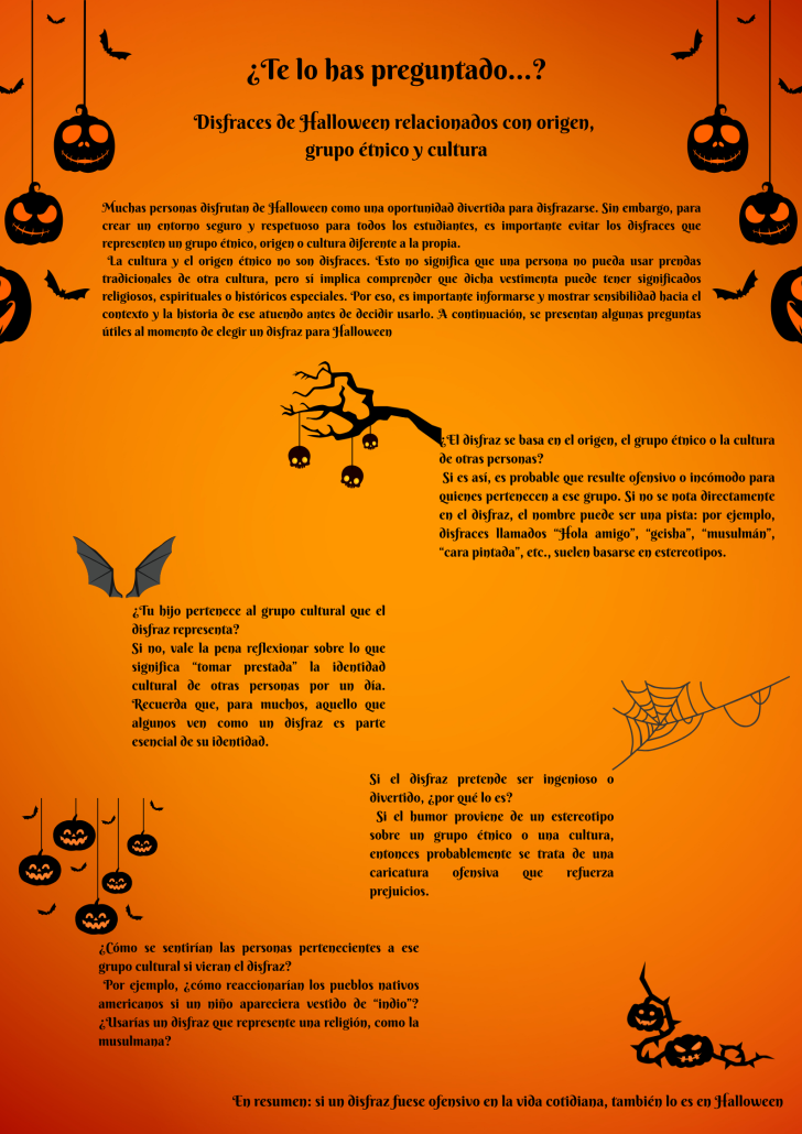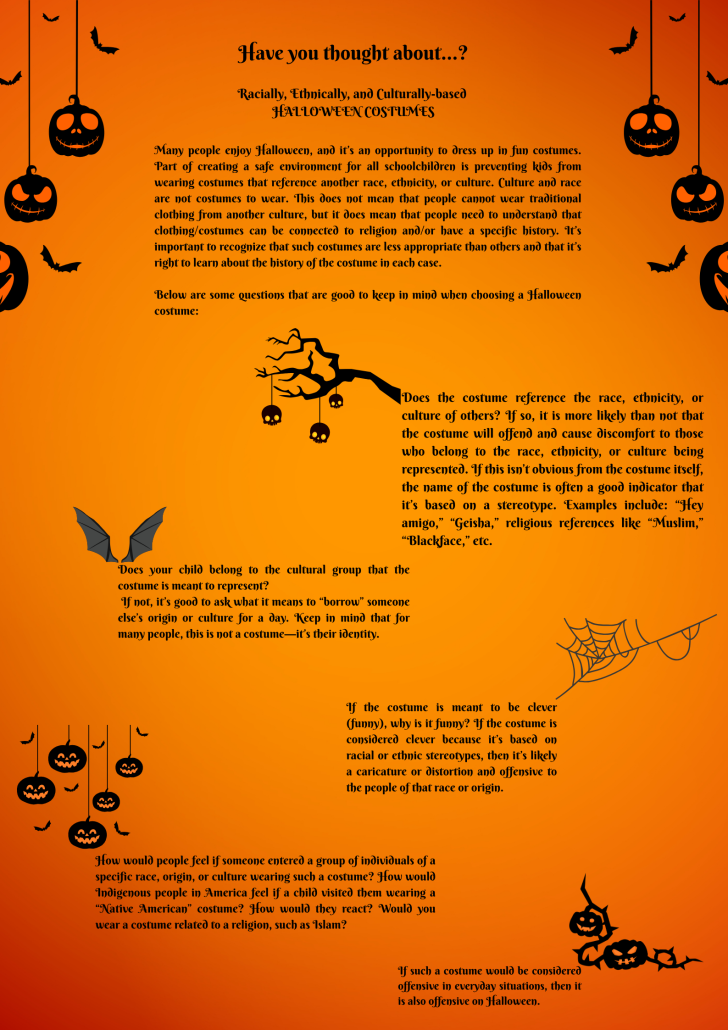 Hluti þess að búa til öruggt umhverfi fyrir skólabörn, öll skólabörn, er að koma í veg fyrir að krakkar klæðist sig í búninga sem vísa í annan kynþátt, uppruna eða menningu. Menning og kynþættir eru ekki búningar til klæðast sig í. Þetta þýðir ekki að fólk megi ekki klæðast sig í hefðbundnum fatnað annars menningarheims, heldur að fólk þurfi að sýna því skilning að klæðnaður/búningur getur tengst trúarbrögðum eða átt sér sérstaka sögu. Það er nauðsynlegt að sýna því skilning að slíkur fatnaður sé síður viðeigandi en aðrir og rétt að kynna sér sögu búningsins hverju sinni.