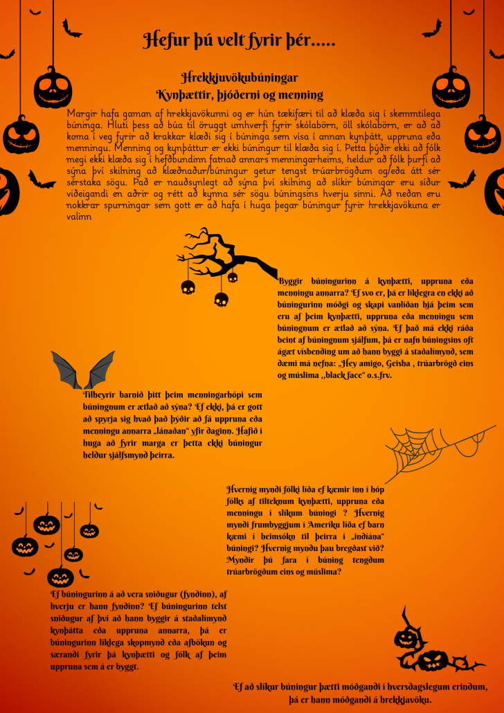 Ef ekki, þá er gott að spyrja sig hvað það þýðir að fá uppruna eða menningu annarra „lánaða“ yfir daginn. Hafðu í huga að fyrir marga er þetta ekki búningur heldur sjálfsmynd þeirra. Hvernig myndi fólki líða ef kemur inn í hóp fólks af tilteknum kynþætti, uppruna eða menningu í slíkum búningi? Hvernig myndi frumbyggjum í Ameríku líða ef barn kæmi í heimsókn til þeirra í „indíána“-búningi? Hvernig myndu þau bregðast við? Myndir þú fara í búning tengdum trúarbrögðum eins og múslima?