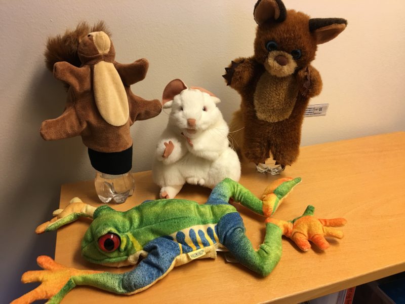 Í leikskólanum Kvistaborg er úrval handbrúða sem eru tilbúnar í spjall og sögugerð.