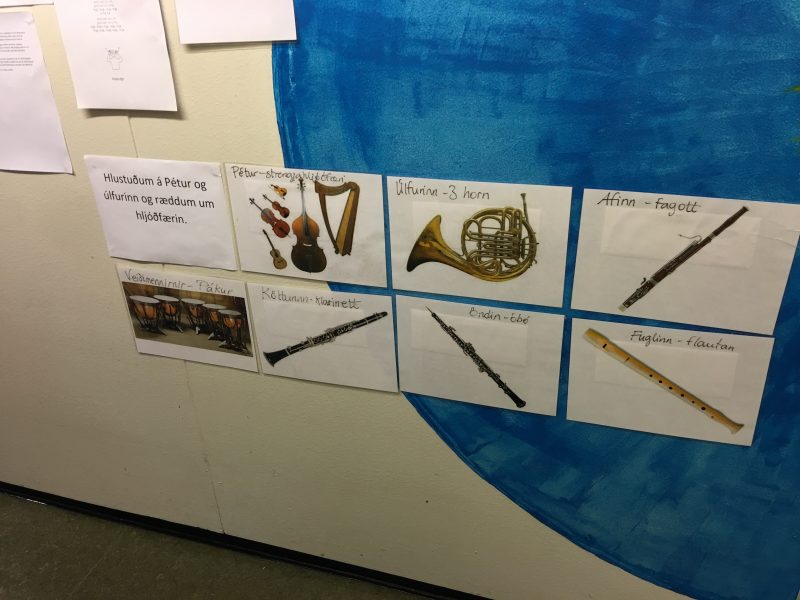 Hlustað var á tónverkið og bókin lesin. Í framhaldi var síðan rætt um hljóðfærin og settar upp myndir af þeim.